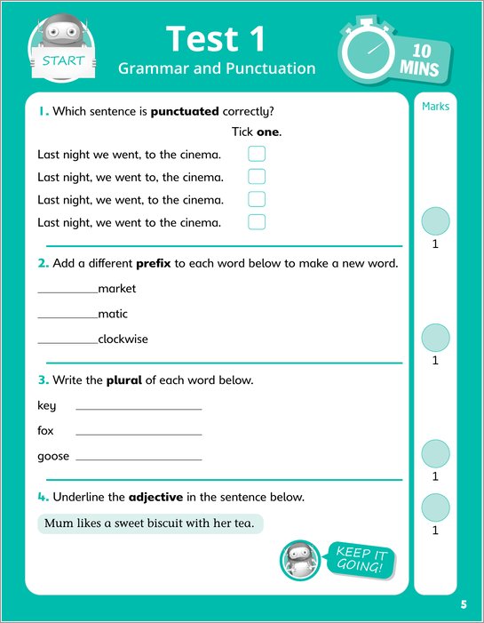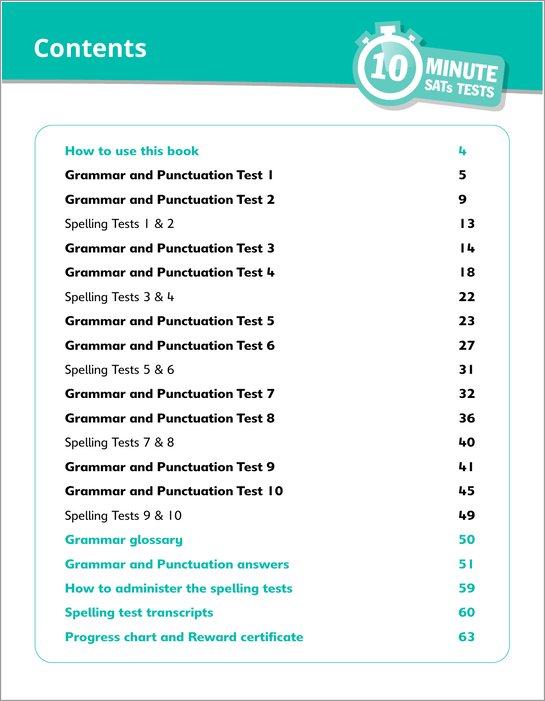 - 10 complete grammar and punctuation tests and 10 spelling tests