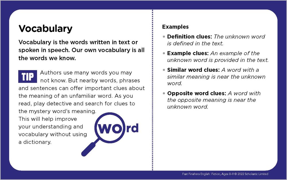 - Comprehension-helper cards that provide kid-friendly definitions, tips, and examples to help students master reading skills
