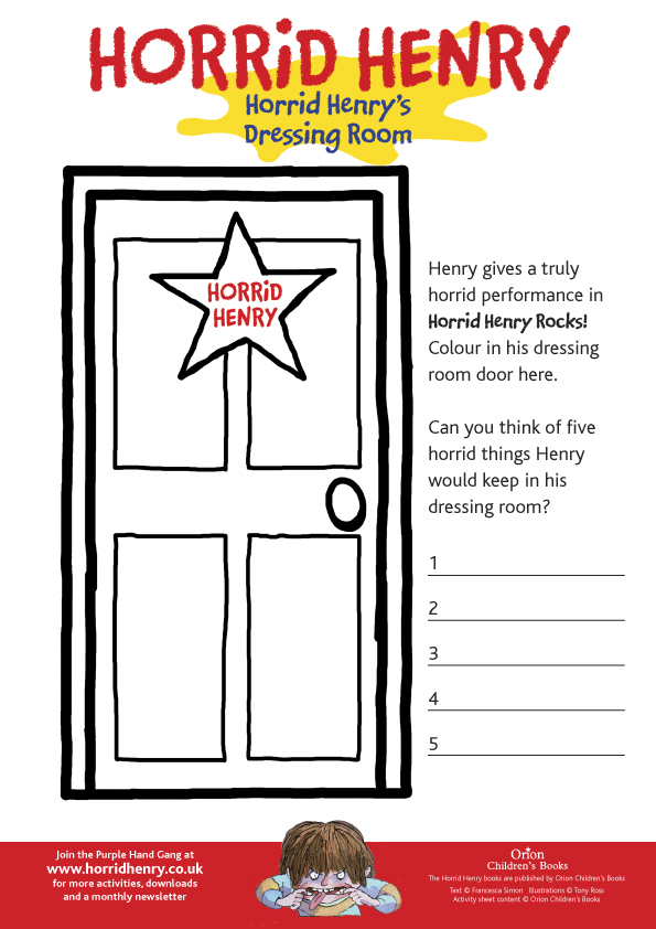Horrid Henry rocks! Colour in his dressing room door, and write down what Henry would keep in there.